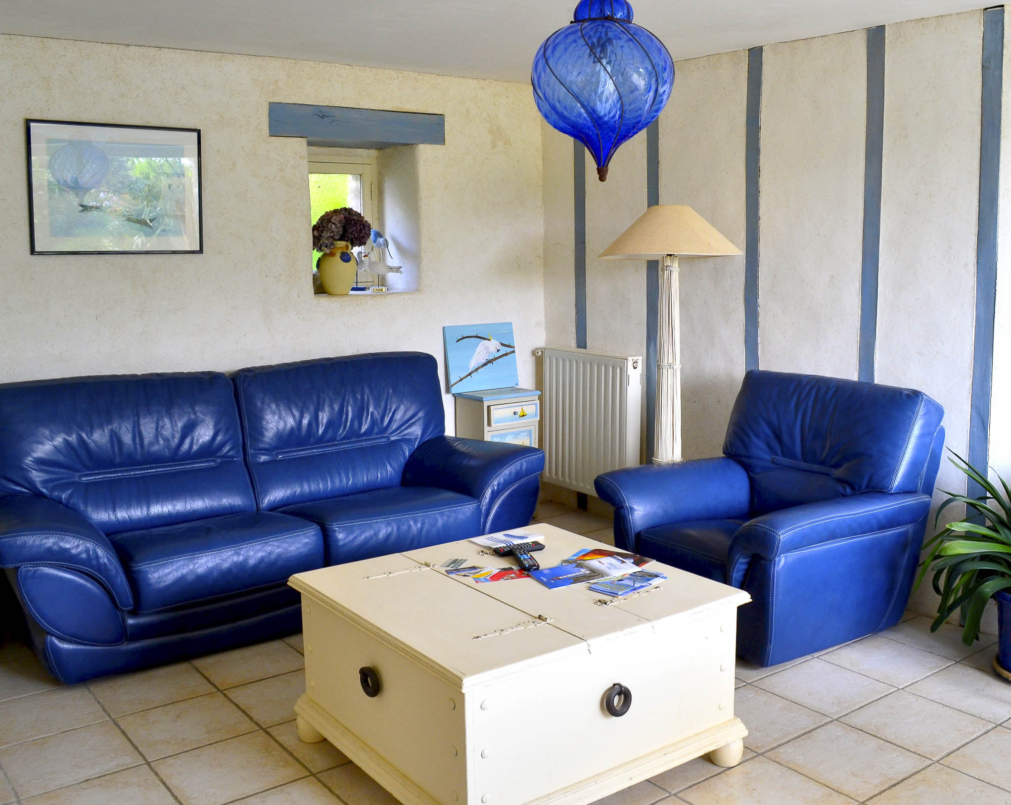 Un salon lumineux, décoré dans un esprit marin bleu et blanc, est réservé pour vos moments d’échange ou de lecture ; une grande baie vitrée ouvre sur le jardin pour profiter pleinement du paysage.
